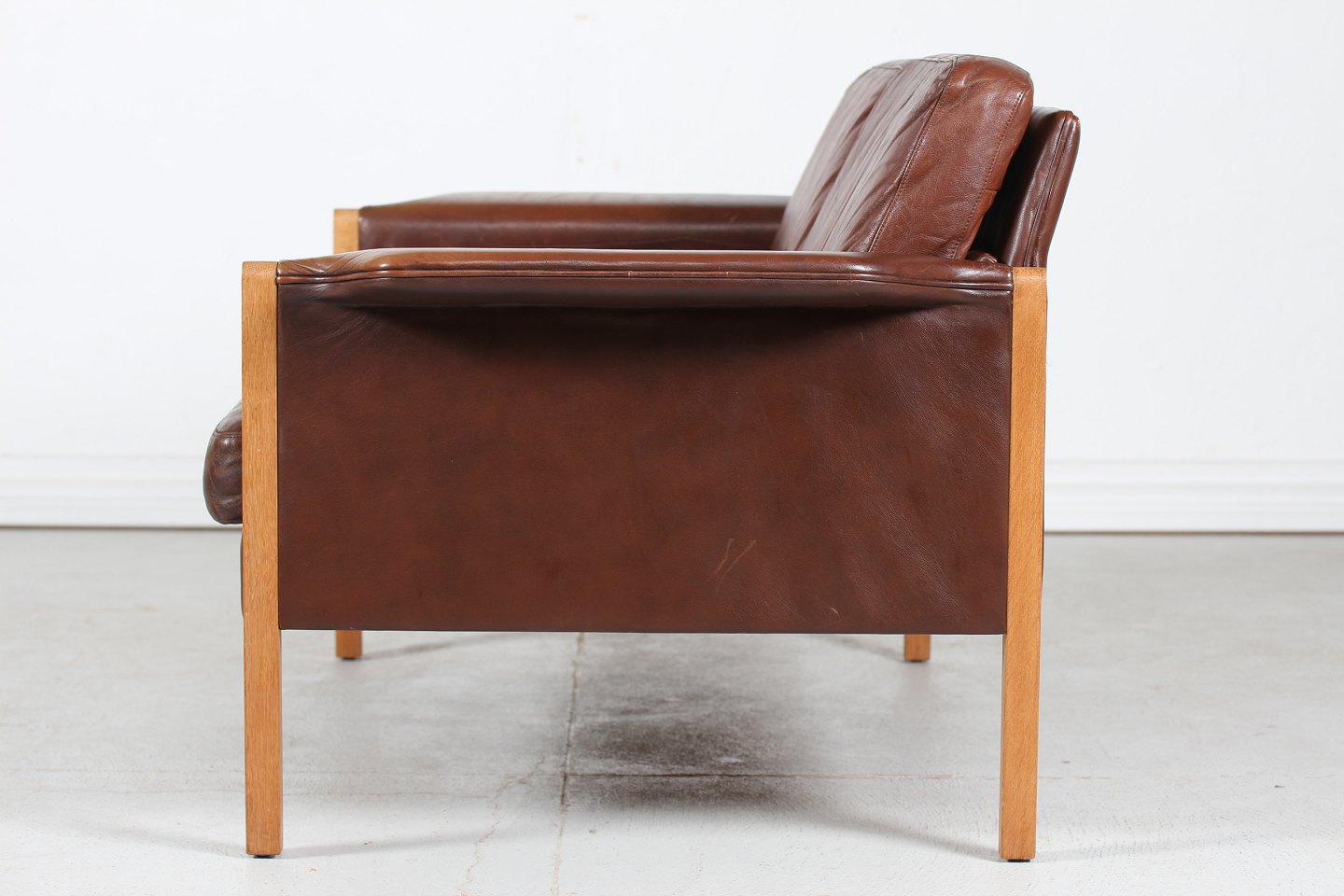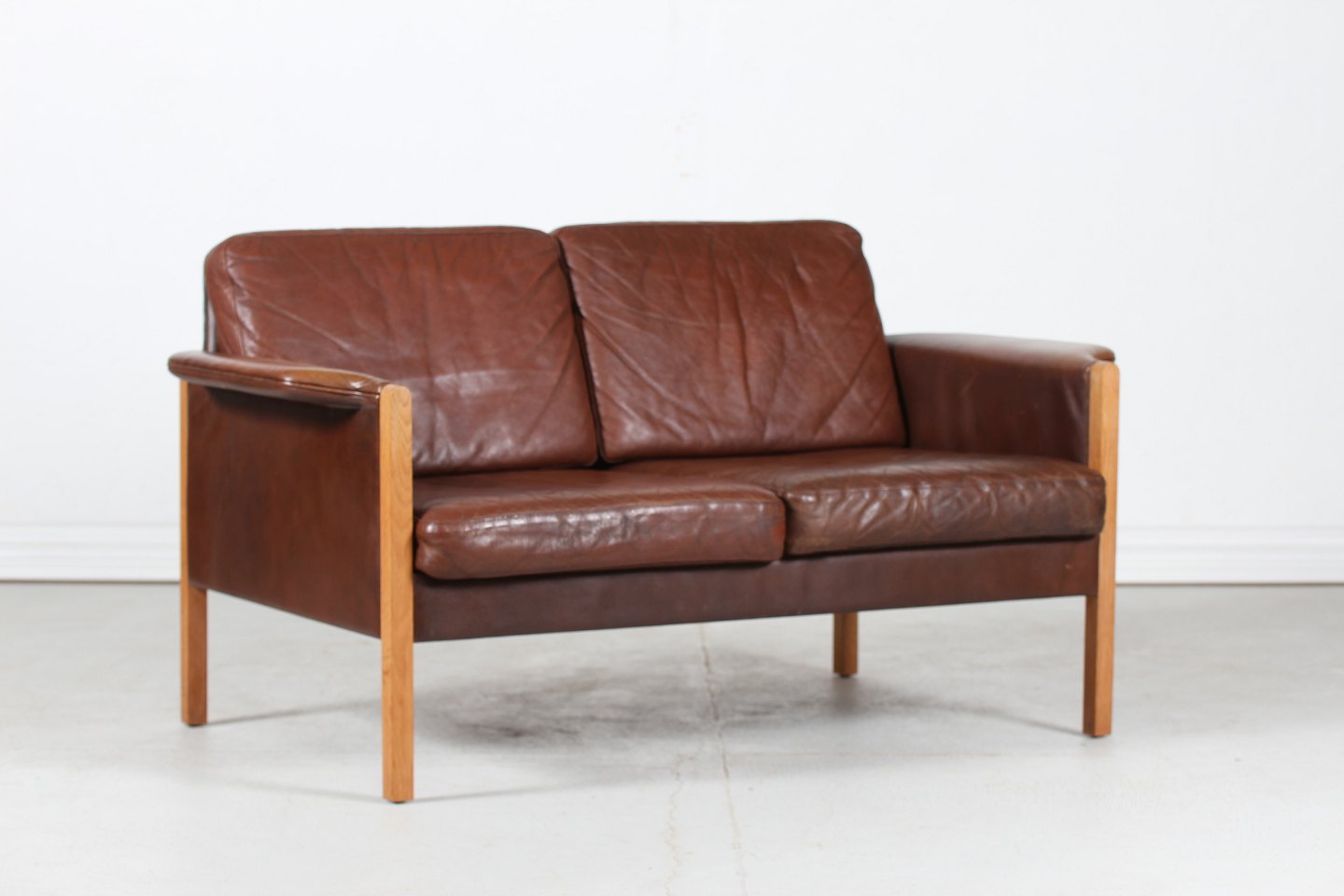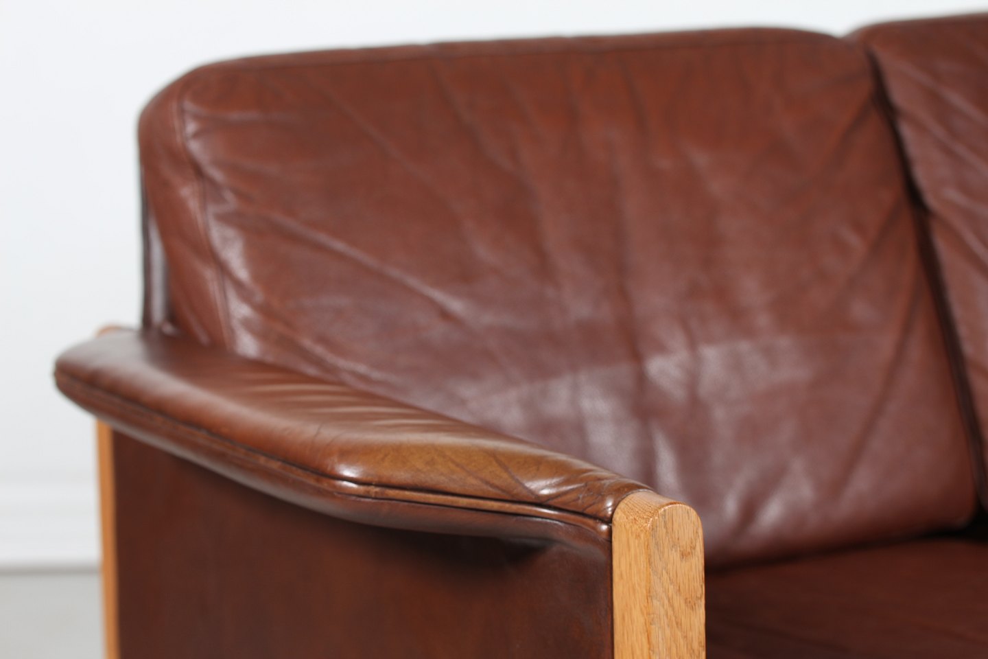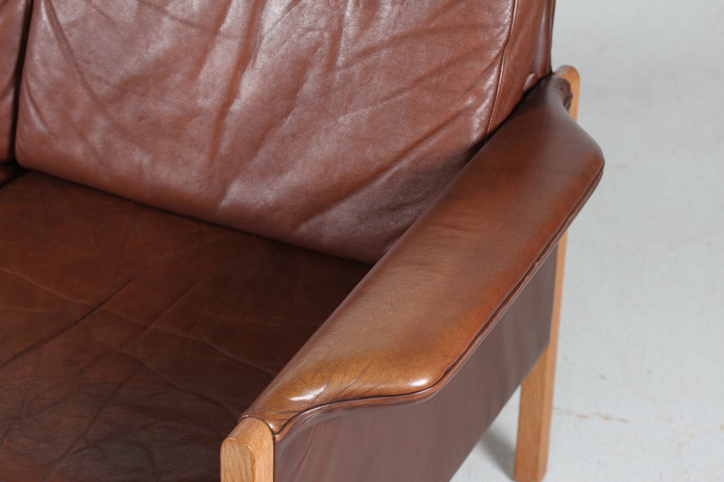 Danish Modern Two seater sofa made of oak upholstered with dark cognac colored/brown leather in the 1970s Height 74/40 cm Length 135 cm Depth 80 cm Danish Manufacturer Nice vintage condition with light patina