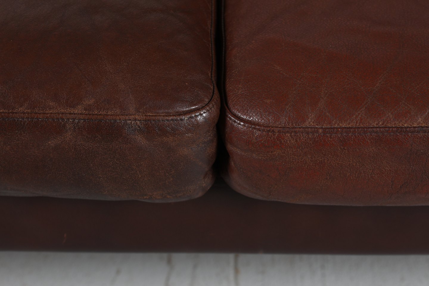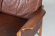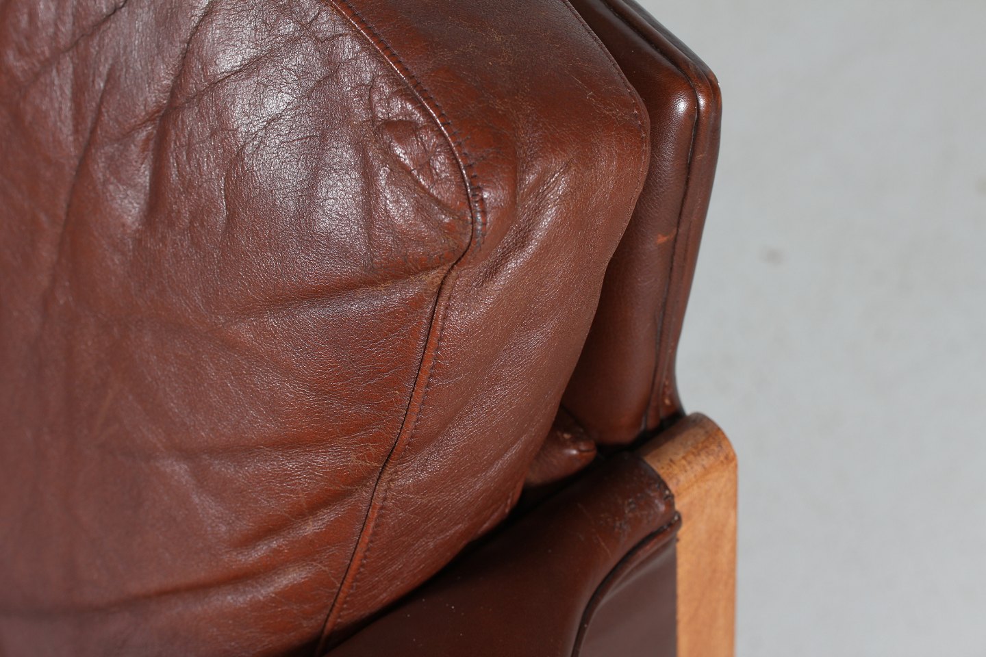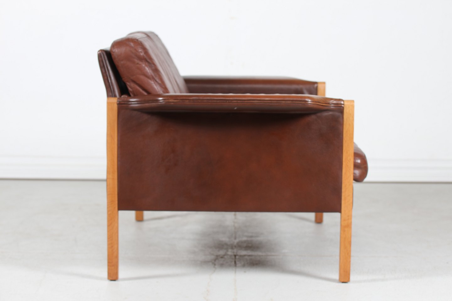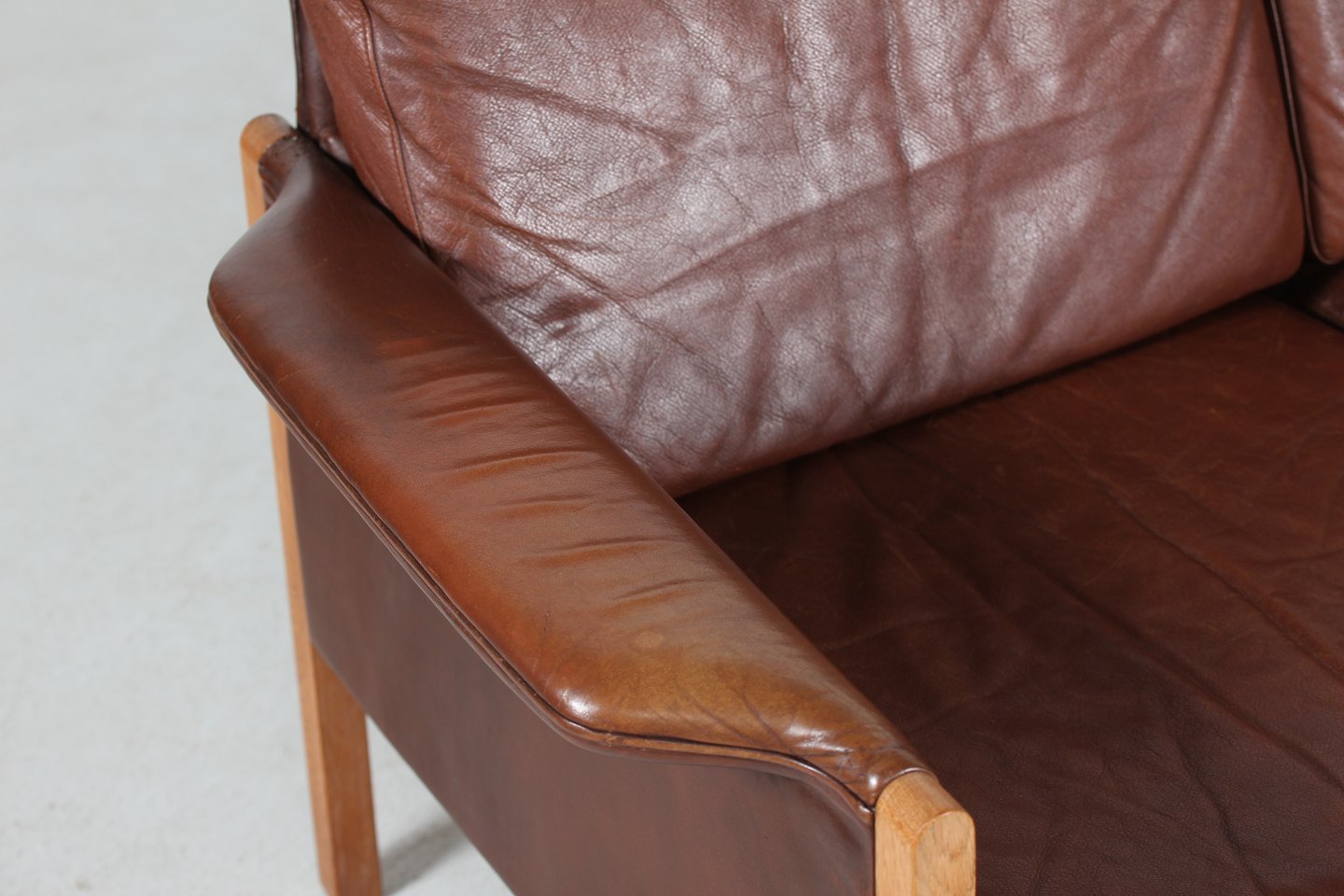 Danish Modern Two seater sofa made of oak upholstered with dark cognac colored/brown leather in the 1970s Height 74/40 cm Length 135 cm Depth 80 cm Danish Manufacturer Nice vintage condition with light patina
