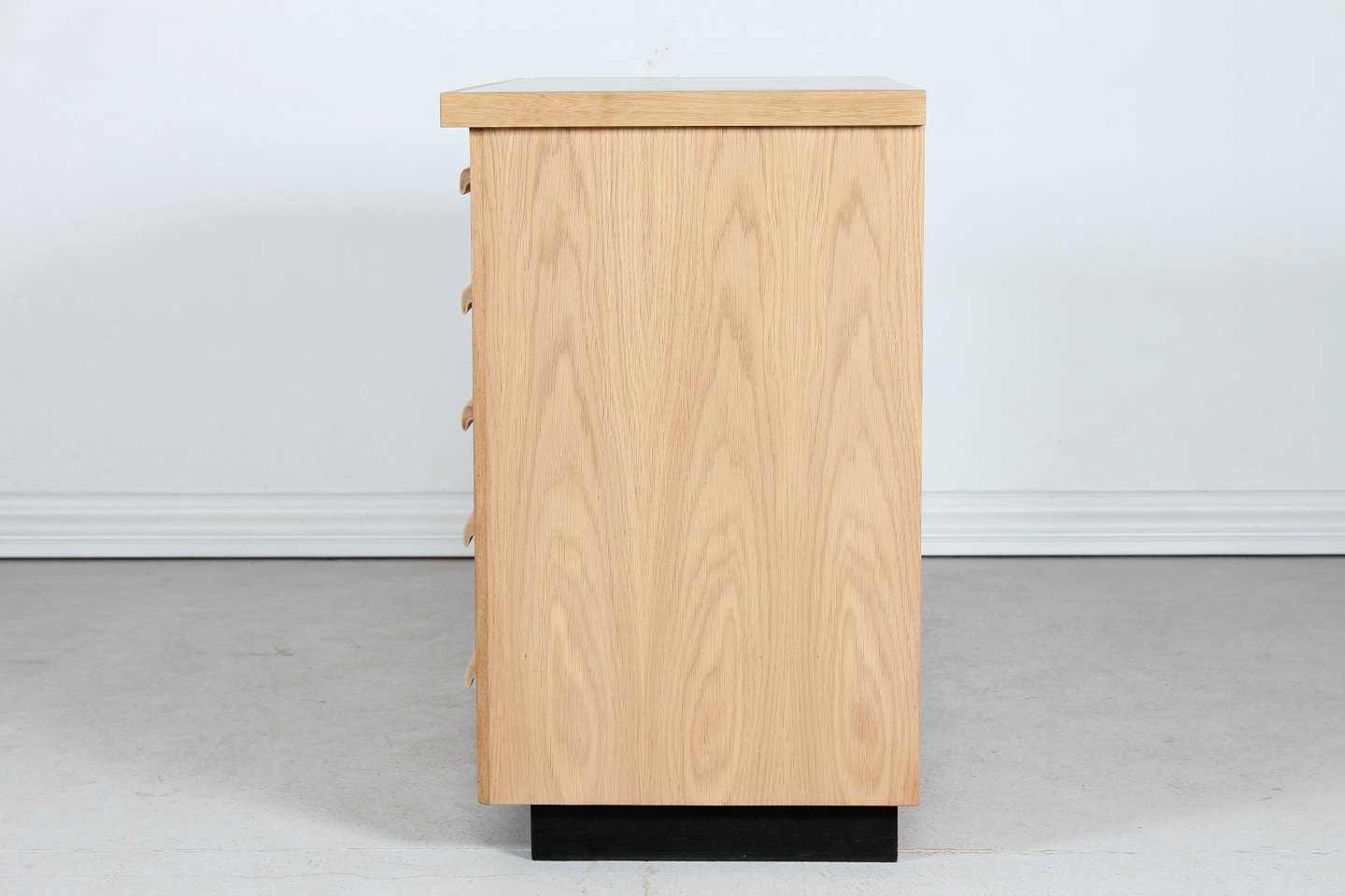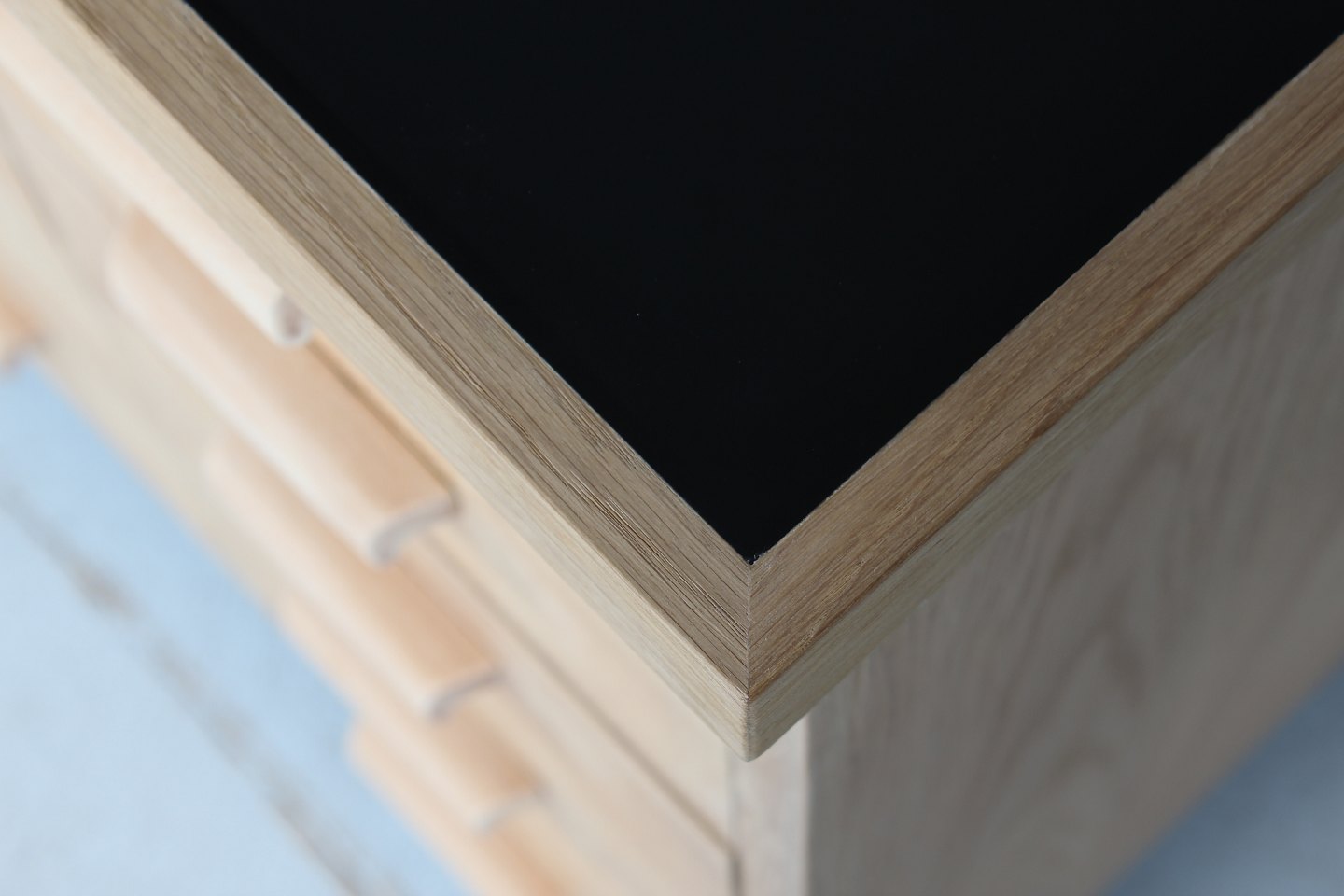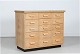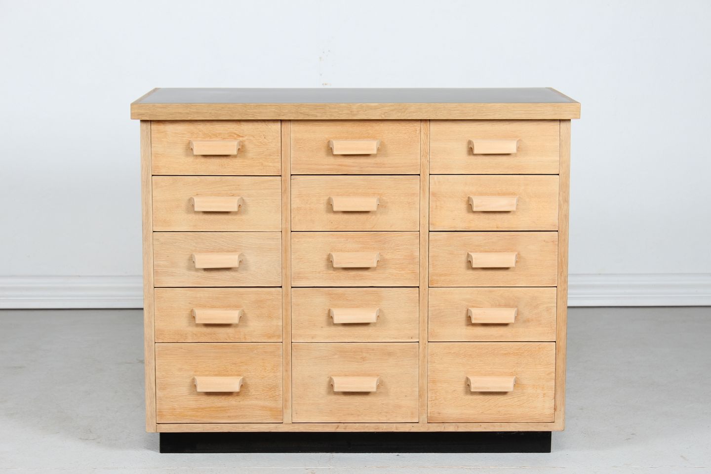 Danish Modern Merchant desk with 15 drawers made of oak, solid and veneer. With black desk top and handles of light colored wood Height 86 cm Length 104 cm Depth 52 cm Danish Manufacturer Nice vintage condition