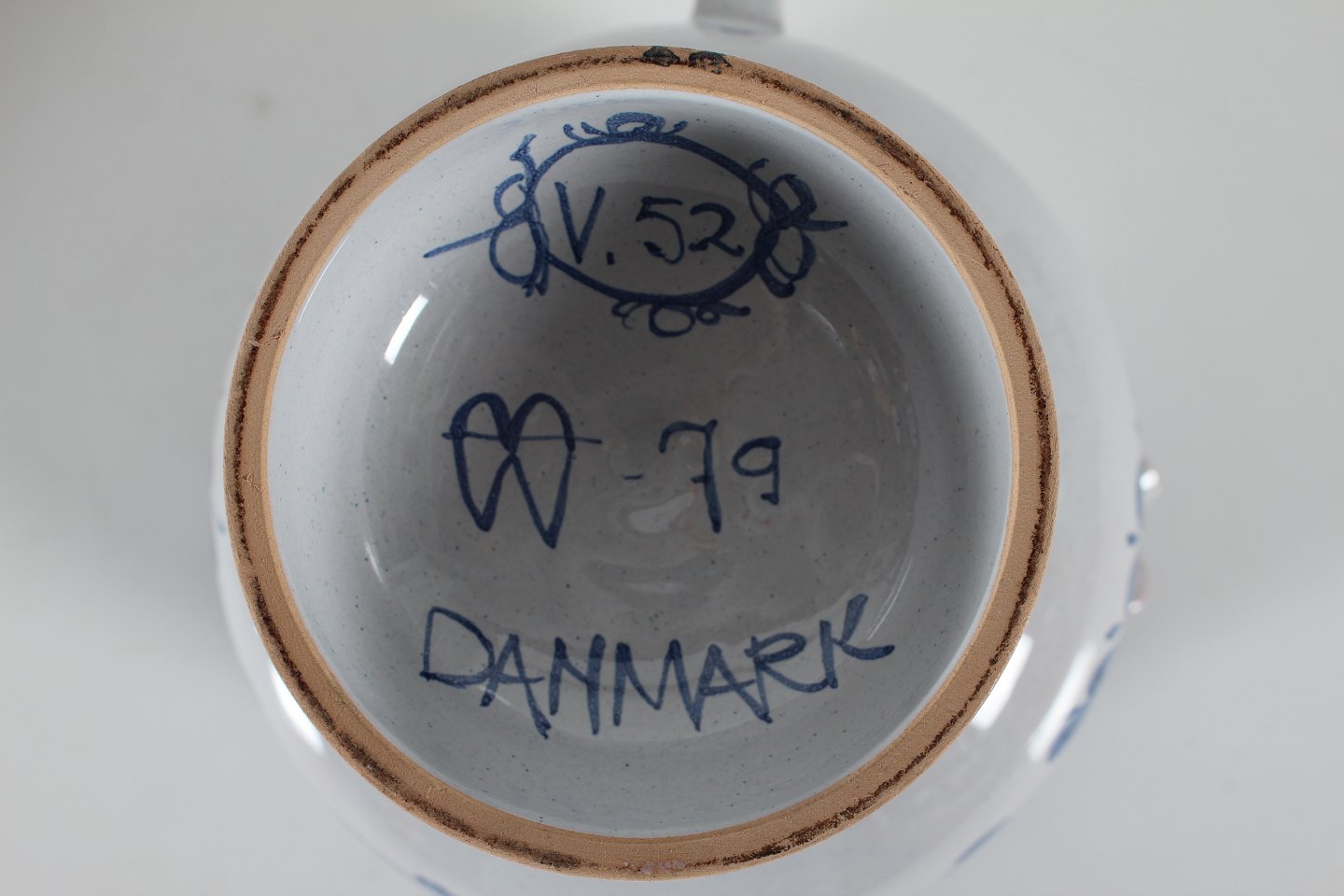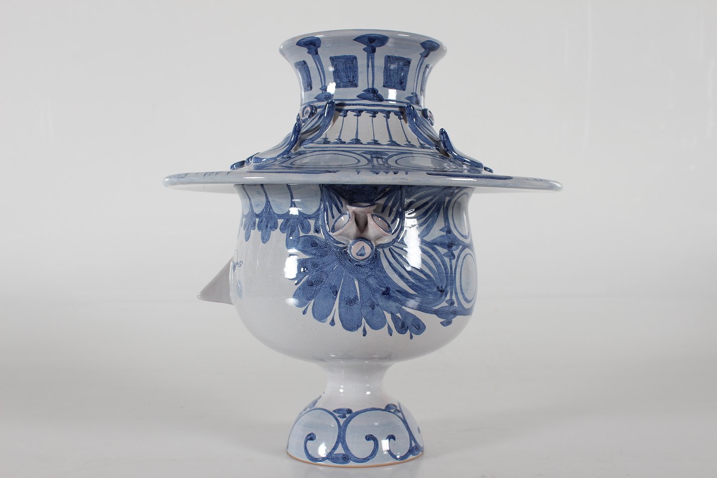 Bjørn Wiinblad - Det Blå Hus Stor lågkrukke udformet som kvindehoved nr. V 52 med håndmalet blå dekoration med lyserød islet Dette eksemplar er fra 1979 - Danmark Højde 31 cm Diameter 30 cm Fin stand uden skår eller revner