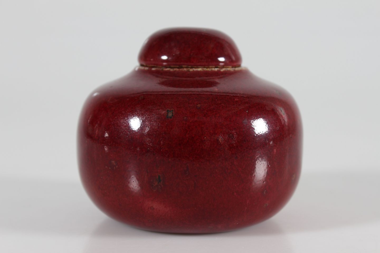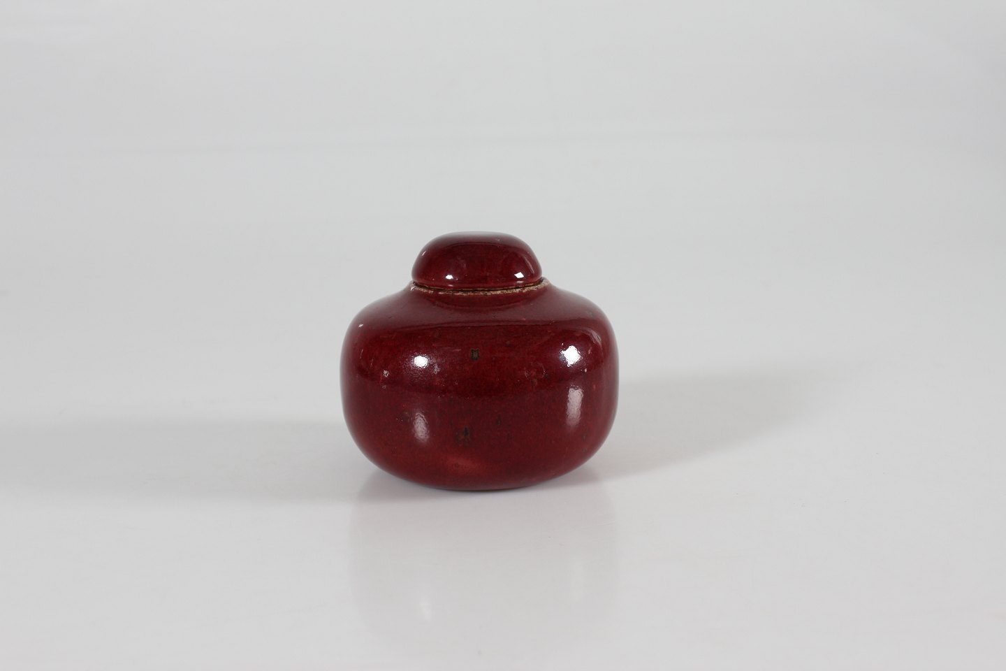 Bing & Grøndahl Valdemar Pedersen (1906-81) Sjælden ganske lille bojan af stentøj dekoreret med okseblodsglasur Med stempel fra 1950'erne Højde 8 cm Diameter 9 cm Fin fejlfri 1. sortering