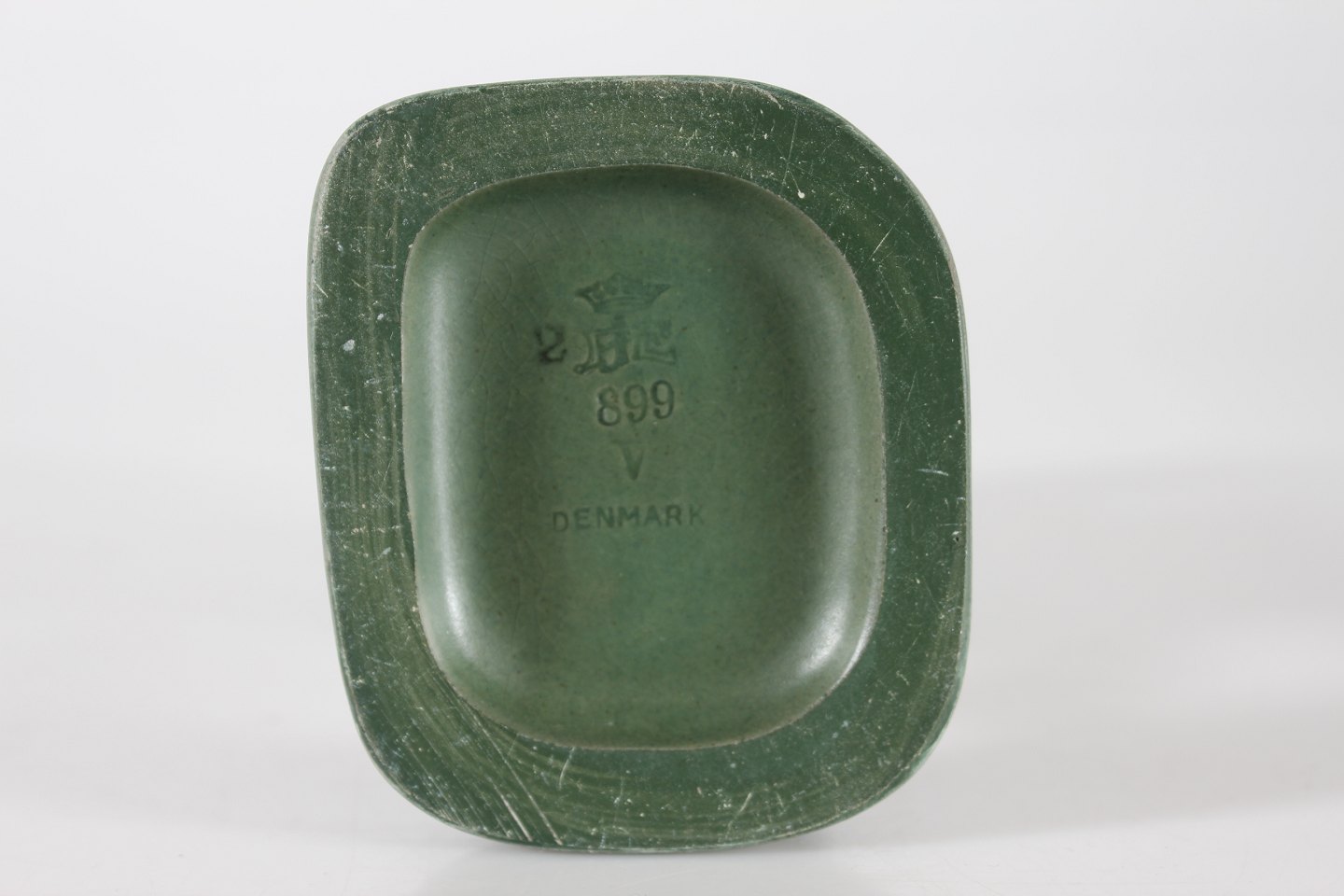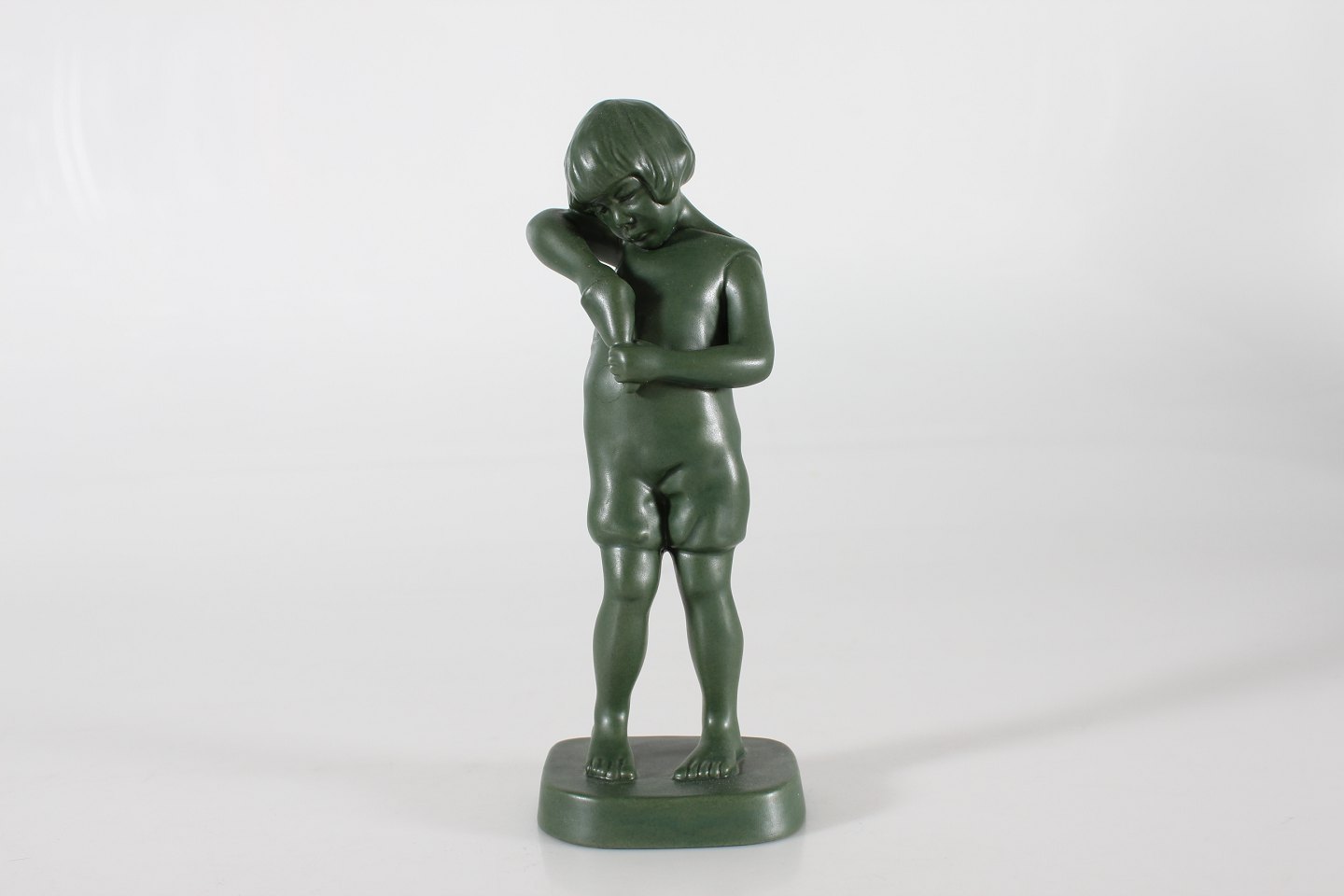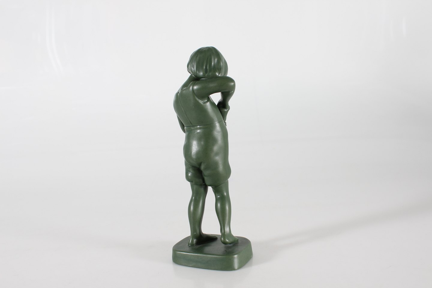 P. Ipsens Enke Figur af dreng med kræmmerhus nr. 899 formgjort af Michaela Karsten (1886-1943) Fremstillet af keramik m/jadegrøn glasur Højde 22,5 cm Fin stand med ganske lille revne i basen