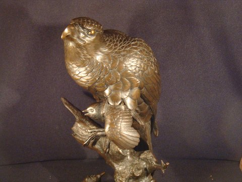 Figure in bronze. Sparrowhawk on tree root in bronze which has its prey in the left claw.