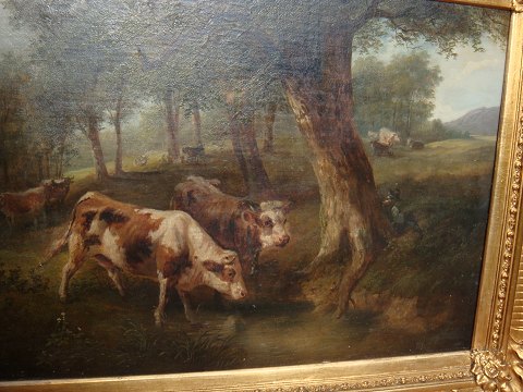 Old English Painting in Beautiful Frame Cows graze in the forest. while the shepherd sleeps under the tree. time calms owned by Shiels schelchau Mark. (kollerup Gods).