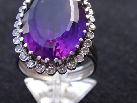 Rosetring. 14k White Gold 585 Great Amatyst surrounded by 28 diamonds. Amatyst about 5 ct. brill: 28 x 0.015 = 0.42 ct Critics length: 23 mm Width: 17 mm Ring size: 55 The ring is polished and beautiful