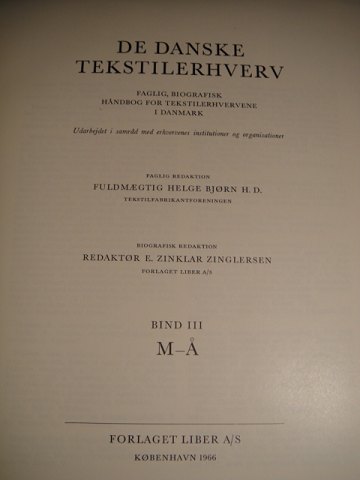 BEAR, HELGE & E. ZINKLAR Zinglersen (RED.). The Danish textile industry. Professional, biographical handbook for textile industries in Denmark. 1-3. 3 vols. Prepared in consultation with the sector's institutions and organizations. Publisher Liber, Copenhagen 1965-66. 549 600 335 pp. With photos and illustrations. Bound Orig. Half leather with gold print and gold upper cut. First edition. price Dkr. 225, -