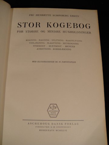 Erken, MRS HENRIETTE Schoenberg: Great cookbook for larger and smaller households. Aschehoug the 1946th Fig. half leather. 823s.
