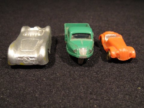 3 plastic cars miniature. Red car: 125, - Green Car sold Silver Grey Car. 75, -