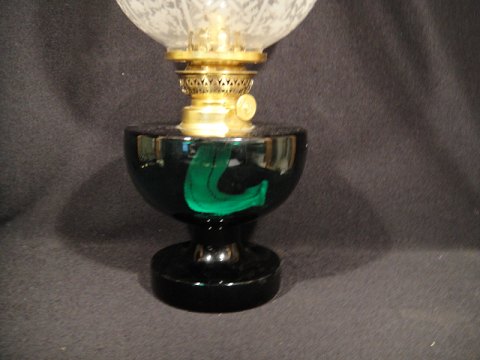 Paraffin lamp in green glass. Height with flue pipe 41 cm. Contact for price