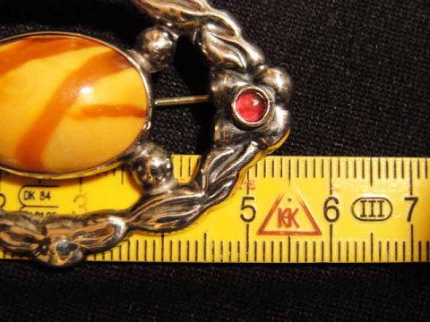 Nouveau brooch with amber and red passport satin.