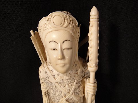 Figure of Ivory. in the form of man with Severe, bow and arrow, book. Standing on Wood . Elfenben Elephantidae sp.flot and well maintained.