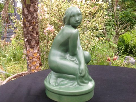 Green Glazed figure from Ipsen's widow. Nude girl pages on the knees. Ipsen No. 923