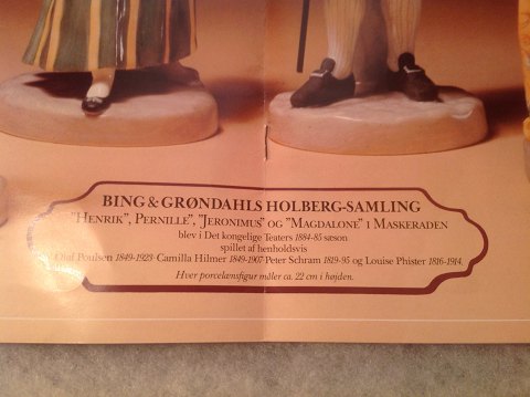 Aldrig tidligere er der blevet lavet en så eksklusiv dansk samlerserie. efter gamle forbilleder har Bing & Grøndahl skabt fire enestående figurer af skuespillere fra Det Kongelige Teater i deres roller som " Henrik " , " Pernille " , " Jeronimus " og " Magdalone " i komedien "Maskeraden". Med største akkuratesse gengives skuespillerne og deres kostumer præcis som de kunne opleves ved 200-års Jubilæumsforestillingen i 1884 på nationalscenen.