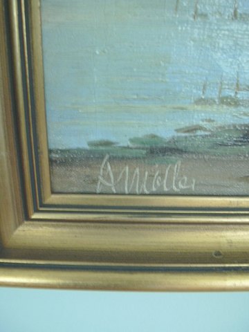 Maleri udsigt ud over bugt sign. A Møller
