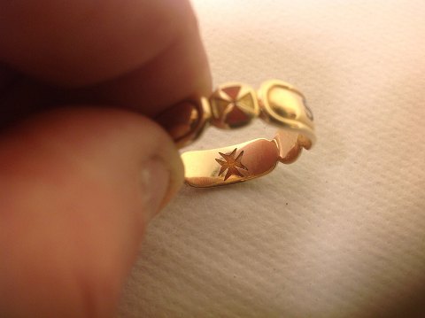 En flot kraftig VIII-grads ring der holder livet ud. 7 mm bred og med indlæg af ægte emalje i mørkeblåt og rødt. Ringene er meget kraftige og står stramt og flot. (De er i en helt anden klasse end hvad der normalt ses i denne type ringe).