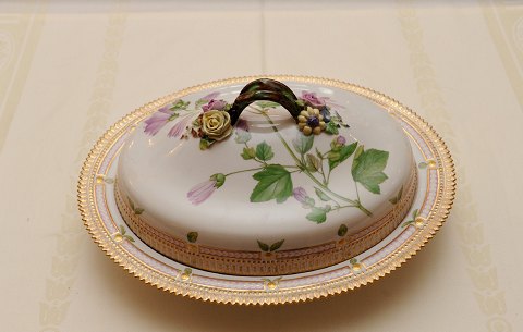 Flora Danica. Prinsesse Dagmars middagsservice af porcelæn dekoreret i farver og guld, bestående af: 12 middagstallerkener med forskellige blomster bl.a. 'Galeopsis Laudanum.L.' og 'Heleosciadium repens. Koch.', no. 3549, Ø ca. 25,3 cm, tre med hver et lille skår, 12 frokosttallerkener med forskellige blomster bl.a. 'Pulsatilla vulgaris Lob.' og 'Lathyrus silvestris. L.', no. 3550, Ø ca. 22,2 cm, seks med små skår samt en med hårrevne, stort ovalt fad med 'Trollius europæus.L.', no. 3519, L. 45 cm, stort ovalt fad med 'Carduus nutans.L.', no. 3519, L. 44,8 cm, kant med lille skår, 11 asietter med bl.a. 'Polygala depressum. L.' og ' Cerastium tetrandrum. Curtis.', no. 3552, Ø 14,2 cm, fem med små skår, oval skål med 'Lysimachia vulgaris. L.', no. 3506, L. 24,5 cm, lille tresidet skål med hank med 'Lonicera floribunda. L.', no. 3544, L. 21 cm, med to små skår og repareret hank, to ovale saucekander på underfade med grenhanke og pousserede blomster med bl.a. 'Fumaris micrantha. Lag.', no. 3556, L. ca. 24 cm, lille tresidet skål med låg og underfad med grenhank og pousserede blomster 'Viola tricolor L. d. arenaria. Sond.', no. 3575, H. 9 cm, stort ovalt lågfad med grenhanke og poussere blomster med 'Lavatera thuringiaca. L.', no. 3567, H. 18 L. 40 cm. Proveniens: Gave fra danske kvinder til prinsesse Dagmars (1890-1961) bryllup med Hofjægermester Jørgen Castenskiold (1893-1978) den 22.1.1922. Prinsesse Dagmar var datter af kong Frederik VIII (1843-1912) og dronning Lovisa (1851-1926) og var opkaldt efter sin faster og gudmor, kejserinde Dagmar (Marie Feodorowna) (1847-1928) af Rusland. Afbildet: Artikel om Herregården 'Kongstedlund' med interieurfotografier med prinsesse Dagmar og Jørgen Castenskiold, Dansk Familieblad 17. april 1962.