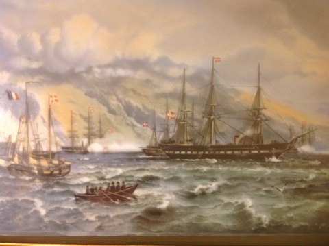 Bing & Grondahl porcelain painting of Frigate Jutland with other sailing ships after painting by C.F. Sorensen.