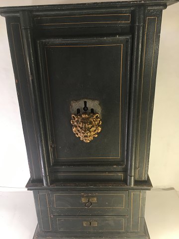Old unique safe in miniature. standing on wooden shelf. with 2 drawers.