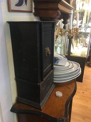 Old unique safe in miniature. standing on wooden shelf. with 2 drawers.