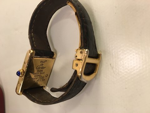 Damearmbåndsur fra Cartier, model Tank, i kasse af forgyldt sterlingsølv, lys cremefarvet skive m. romertal, optrækskrone prydet m. carbochonsleben safir, mineralglas, monteret m. original brun Cartier læderrem med forgyldt spænde, quartz urværk. Ø. 27,9 x 23,5 mm.