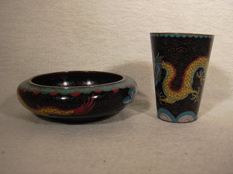 Alt Cloisonné Schüssel und Becher mit Drachen-Motiv und innere Schmelz gutem Zustand.