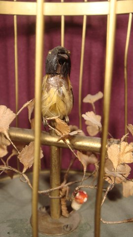 Mekanisk Fugle i bur af messing med optræk i bunden