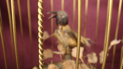 Mekanisk Fugle i bur af messing med optræk i bunden