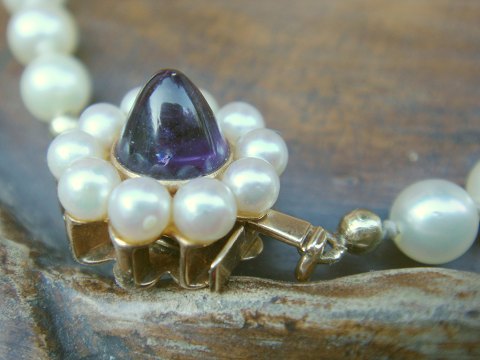 Flot Saltvands perlekæde med 14k 585 guldlås på sat små perler og amatyst længde 41,5 cm