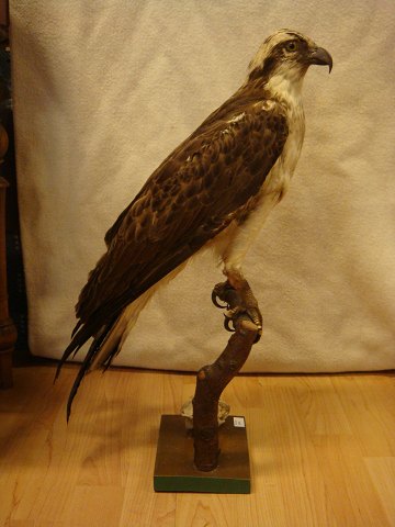 Udstoppet fiskeørn på stand med kranie. Aquila chrysaetos