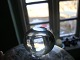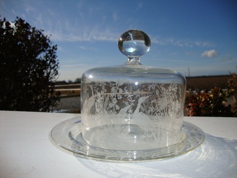 Osteklokke på fad. Klokke dreven m. plansleben knop, ætset motiv med traner på eng. Fadets rand ætset med blomsterbort, Kastrup glasværk 1910.Osteklokkens diameter 13,5 cm. højde med fad 16 cm.