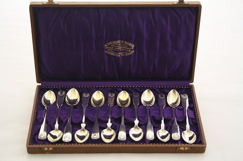 12 stk. Musling kaffeskeer i æske, tretårnet sølv, længde 11 cm. solgt