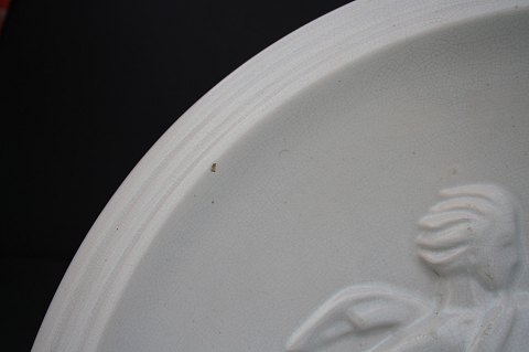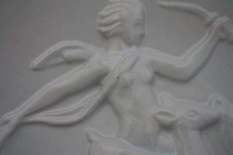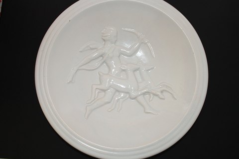 Michael Andersen, Bornholm. Rundt hvidt fad. Motiv: Kvinde med bue og 2 rådyr. Der er 2 små afslag i glasuren, se ekstra fotos. Højde 6 cm. Diameter 35 cm. Pris 250 kr.