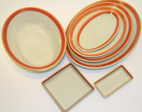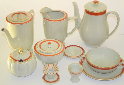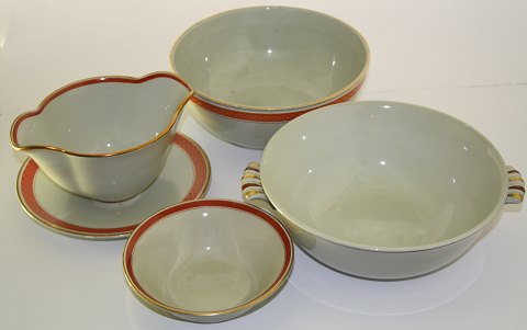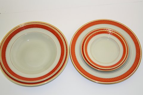 Aluminia, Tureby, grå fajance med orange fane samt guldkant. Designet af Nils Thorsson 1934-1968. Almindeligt brugsslid. Overfladekrakeleringer kan forekomme.