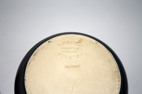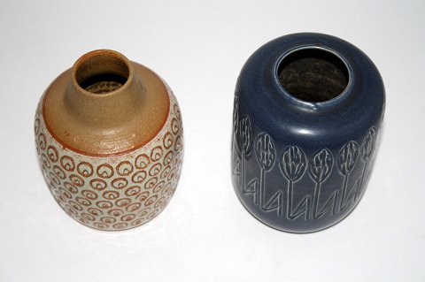 Søholm stentøj, Bornholm. Brun vase. Højde 13,5 cm. Diameter 9,5 cm. Pris: solgt Blå vase. Højde 13,7 cm. Diameter 10 cm. Pris: solgt