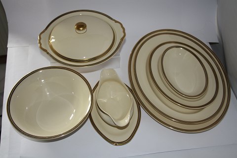 Johnson Bros. Victorian cremefarvet fajance spisestel med sorte og guld kantstriber. Rimelig stand.