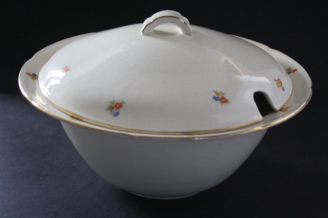 Aluminia fajance, Anna Sofie trykte støbuketter og guld. Designet af Nils Thorsson. Produceret i perioden fra 1940-1966. Suppeterrin med låg, hvor der er hul til opøserske. Højde 12 cm. Diameter 27 cm. Højde med låg 18 cm. God stand. Pris: SOLGT