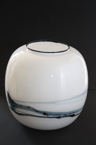 Holmegaard, Atlantis serien designet af Michael Bang i 1980. Farveklatter og tråde i blåt glas på opal hvidt og klart glas. Blæst i tre lag glas. Vase højde 22 cm. Diameter 21 cm. Pris: SOLGT