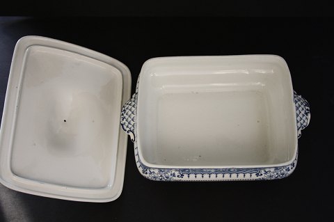 Stor Terin med ører, låg og underfad. Terrin højde med låg 19,5 cm. I låget er der hul med plads til suppeske. Højde uden låg 11 cm. Længde 30 cm. Bredde 19 cm. Der er misfarvet krakelering se ekstra foto. Underfad 32 x 25 cm. Der er et lille kantafslag på underfadet, samt misfarvet krakelering. Pris: 475 kr.