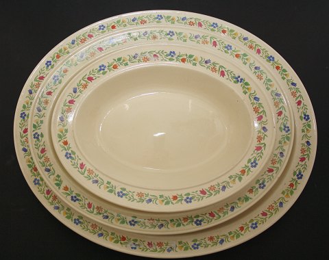 Gustavsberg, Backafall, Flint Porslin. Cremet fajancestel dekoreret med små blomster på fanen. Diverse dele til spisestel. Krakeleringer forekommer da det er et fajancestel.