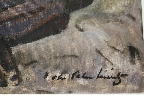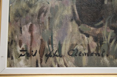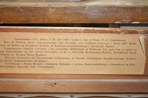 Maleri frit efter Clemens af Chr. Valentinussen født 1903 i Løkken. Maleriet er signeret i højre hjørne. I venstre hjørne står der frit efter Clemens. Maleriet er omgivet af en træguldramme med enkelte småskader. Maleriet måler 70 x 100 cm. Med ramme måler det 85 x 115 cm.
