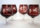 Bøhmisk krystal. Bordeauxfarvede cognacglas. Højde 13 cm. 4 stk. Det ene med indvendigt afslag, se ekstra foto. sælges samlet. Pris: 350 kr.