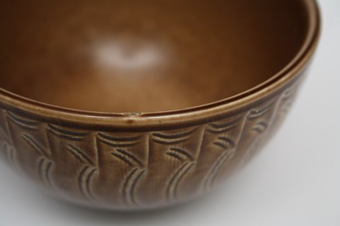 Skål i lysebrun mat glasur med mønster. Dek. nr. 1681. Højde 7 cm. Diameter 12,5 cm. Lager: 2 stk. Pris: 375 kr. Den ene skål har et lille afslag, se ekstra foto. Pris: 300 kr.
