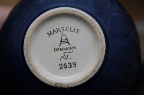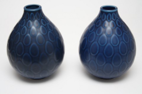 Aluminia, Marselis, kunststengods designet af Nils Thorsson i perioden 1953-1960. Vaser i koboltblå mat glasur med olivemønster. Dek. nr. 2633. Højde 14 cm. Diameter 9,5 cm. Flot stand. Pris: solgt