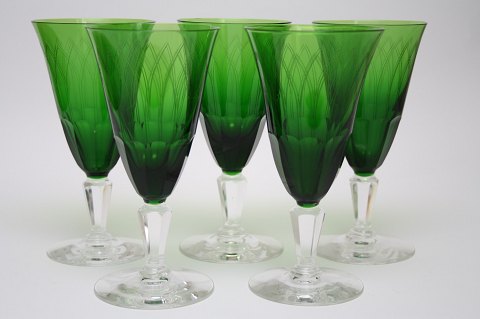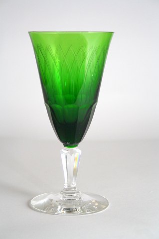 Visborg krystalglas designet af Jacob Bang i 1952. Hvidvin med grøn mønster slebet kumme. Højde 14,3 cm. Pris: Et glas med micro afslag på kant.