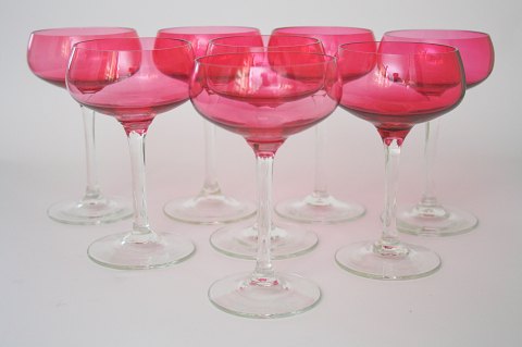 Smukke drinks eller champagne skåle med rosa kumme og klar stilk. Højde 14 cm. Diameter 7,2 cm. 8 stk, desværre lille kantafslag på et af dem. Sælges kun samlet. Pris: SOLGT