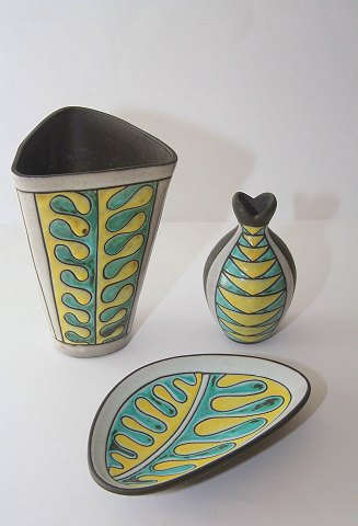 Michael Andersen, Bornholm glasseret negroserie, sort stentøj med gul, grøn og hvid glassering. Designet af Marianne Starck i midten af 1950'erne. Alle i perfekt stand