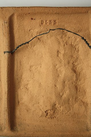 Søholm, Bornholm, relief med 2 fugle og 2 blomster i blå/brun glasur. Dek. nr. 5515. Signeret GHP, Gerd Hjort Petersen. Dybde 3 cm., længde 39,5 cm. Bredde 22 cm. Der er et afslag bagpå, som ikke ses når den er hængt op, se ekstra foto