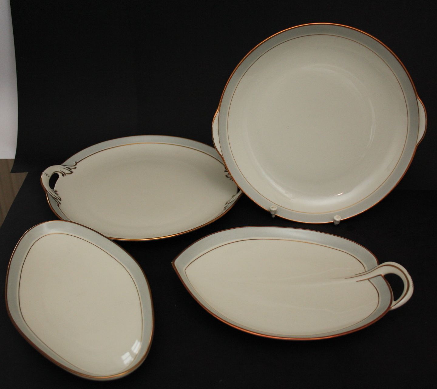 Kjøbenhavns Porcelæns Maleri, Graasten. Elfenbensfarvet glasur med lysegrå kant omkranset af guldstriber. Stellet er produceret fra 1956.