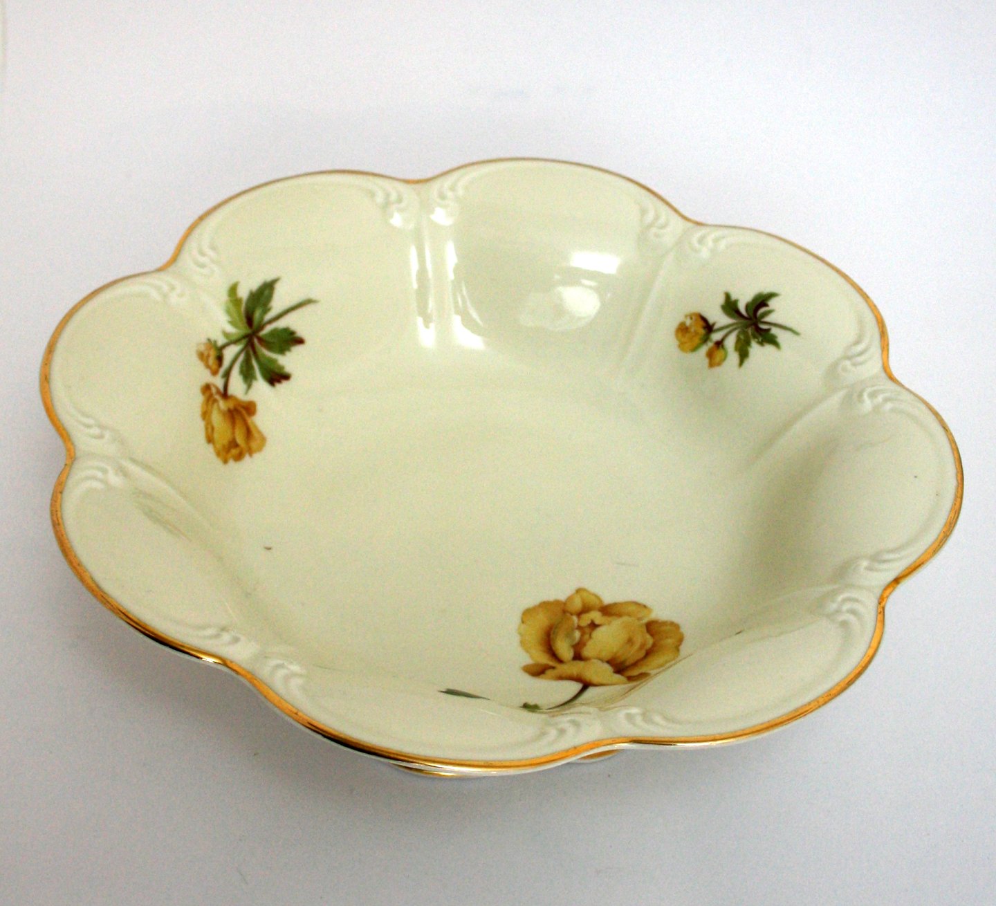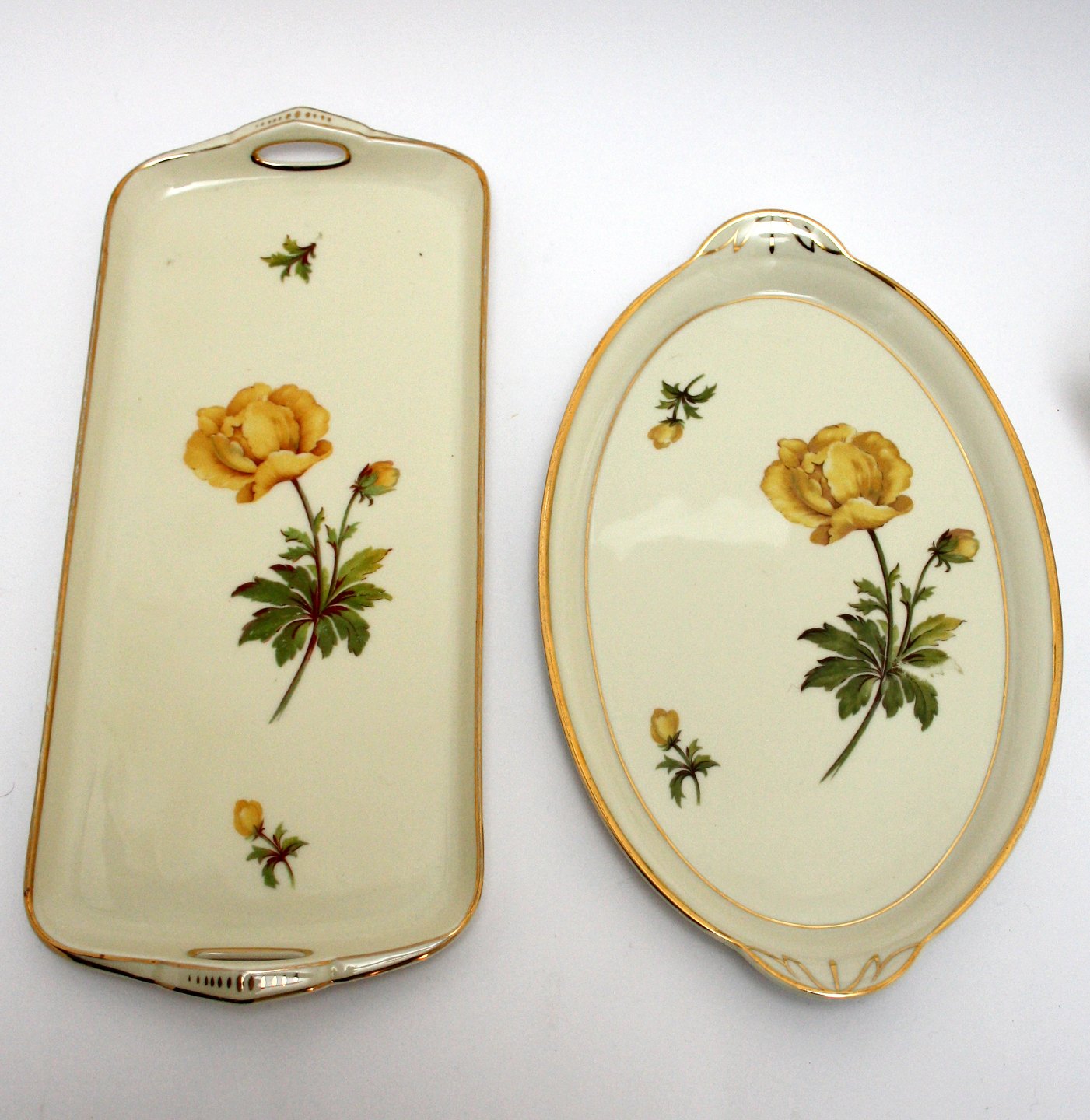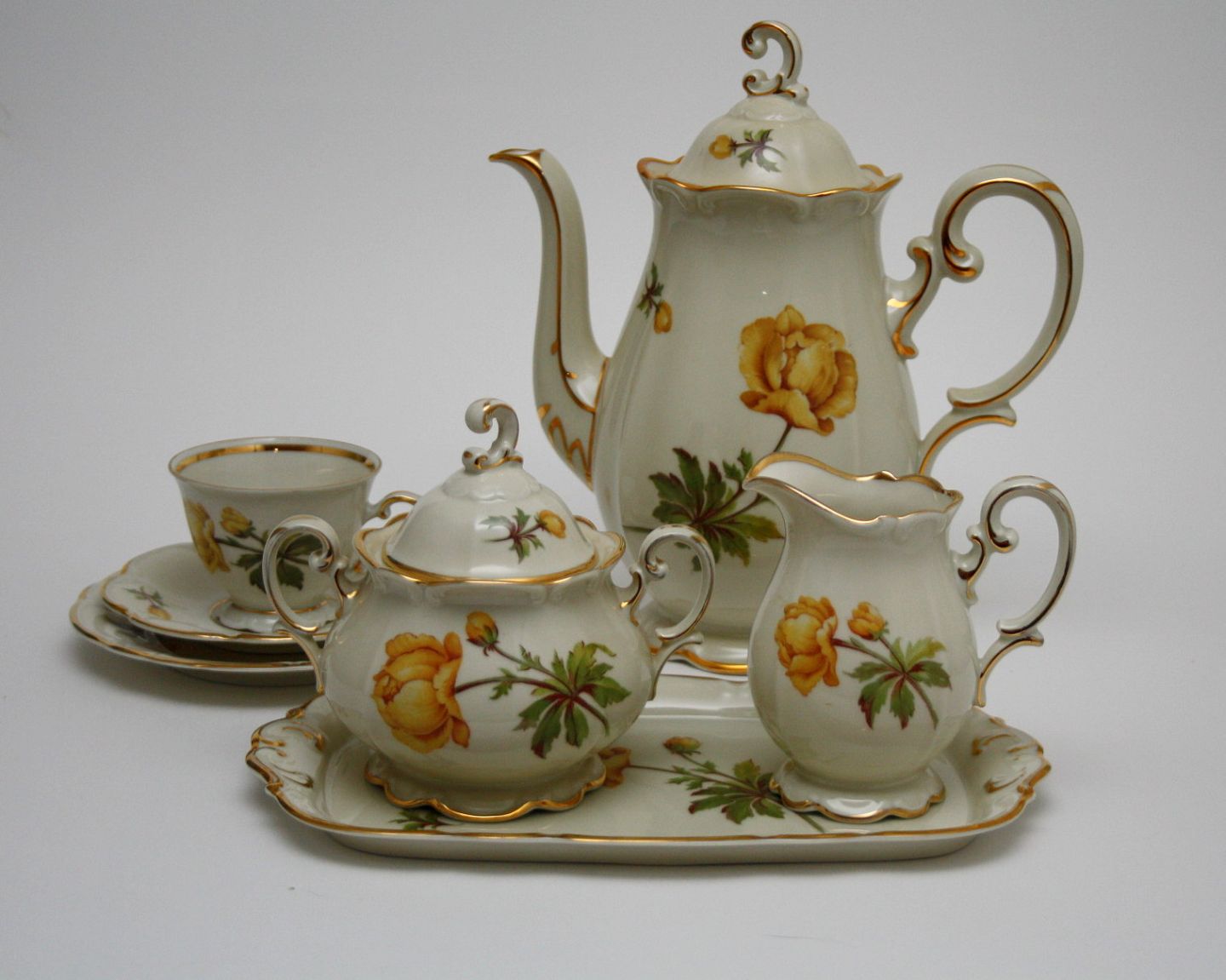 Bavaria, Tirschener cuth, Engblomme, dekoreret på Antoinette eller Marie Antoinette cremefarvet stel med gule blomster og guldkanter. Importeret af Norden og senere Bucka og Nissen. Stellet er dekoreret i Danmark. Stellet er meget velholdt med intakte guldkanter.
