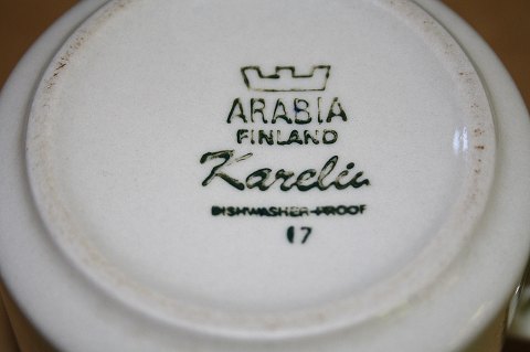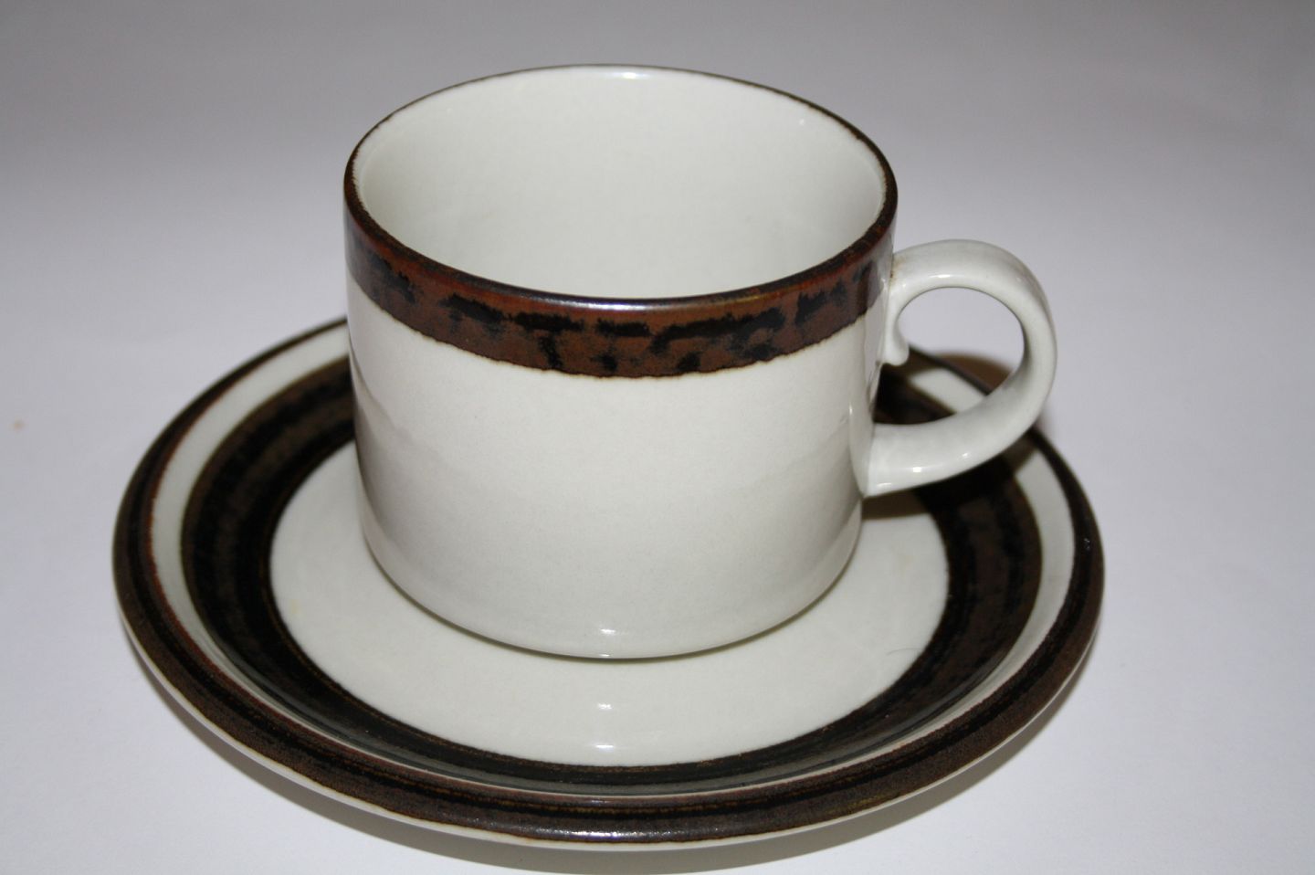 Arabia stoneware, Finland, Karelia designet af Anja Jaatinen i 1975. Tekop med underkop. Højde 7 cm. Diameter 8,5 cm. Pris: 75 kr. stk. Lager: 10
